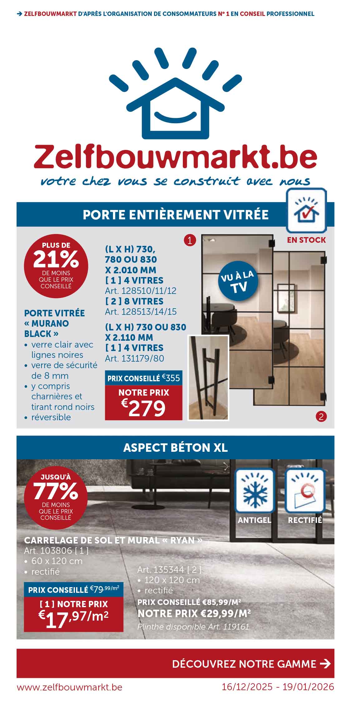 Découvrez les dernières dépliantes et restez informé de nos promotions actuelles, de nos remises saisonnières et de nos offres spéciales ! Vous trouverez ici tout ce dont vous avez besoin pour votre prochain projet de (re)construction. Feuilletez nos brochures et découvrez les meilleures offres sur toutes sortes de produits d'intérieur, meubles de salle de bain, portes intérieures, cuisines, carrelages, et bien plus encore.